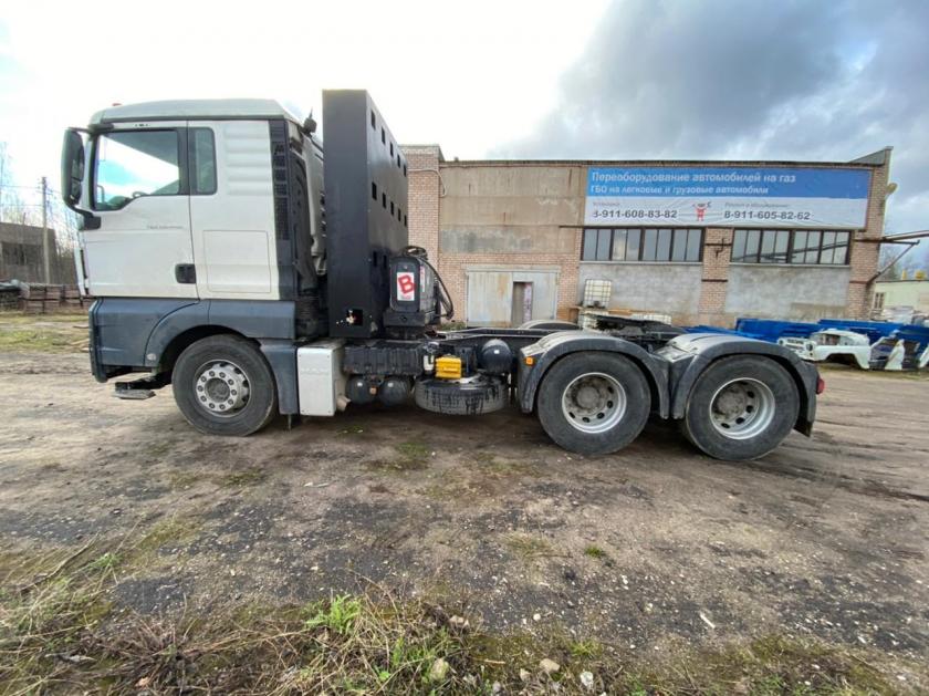На фотографиях представлен автомобиль MAN TGX 26.44 6x4 BLS, переоборудованный для работы на двойной топливной системе — ДТ или ДТ+CNG/КПГ.