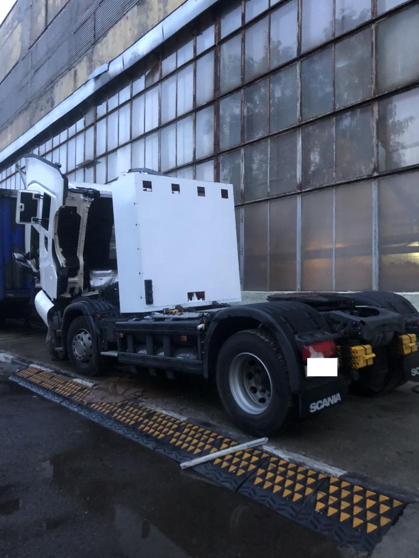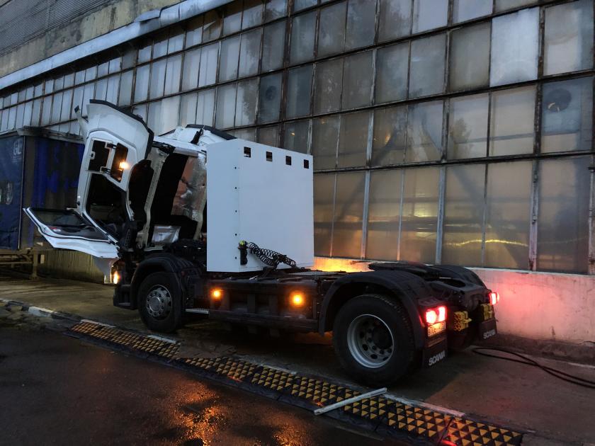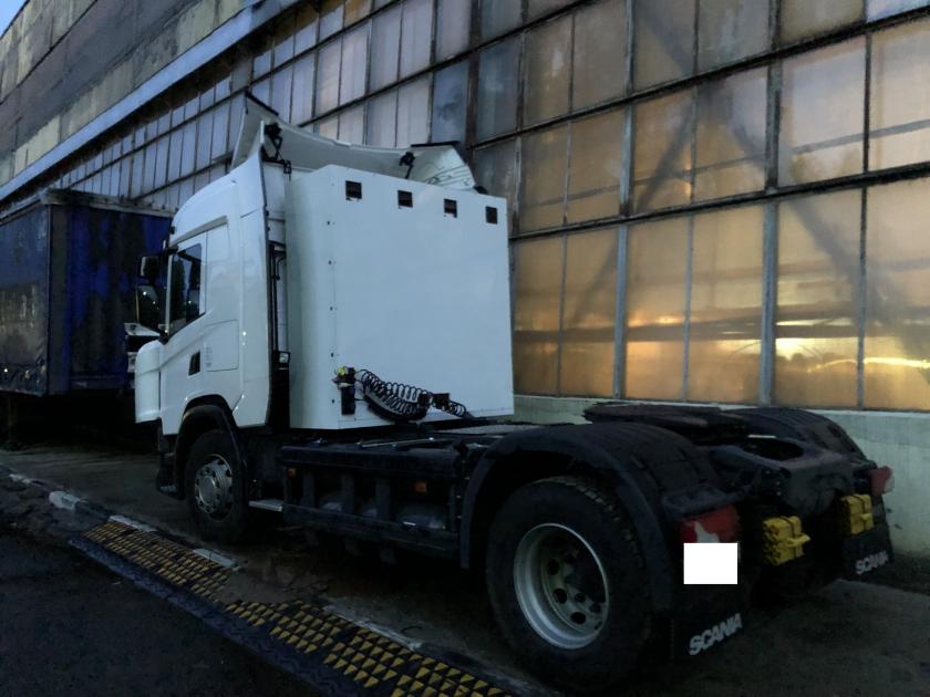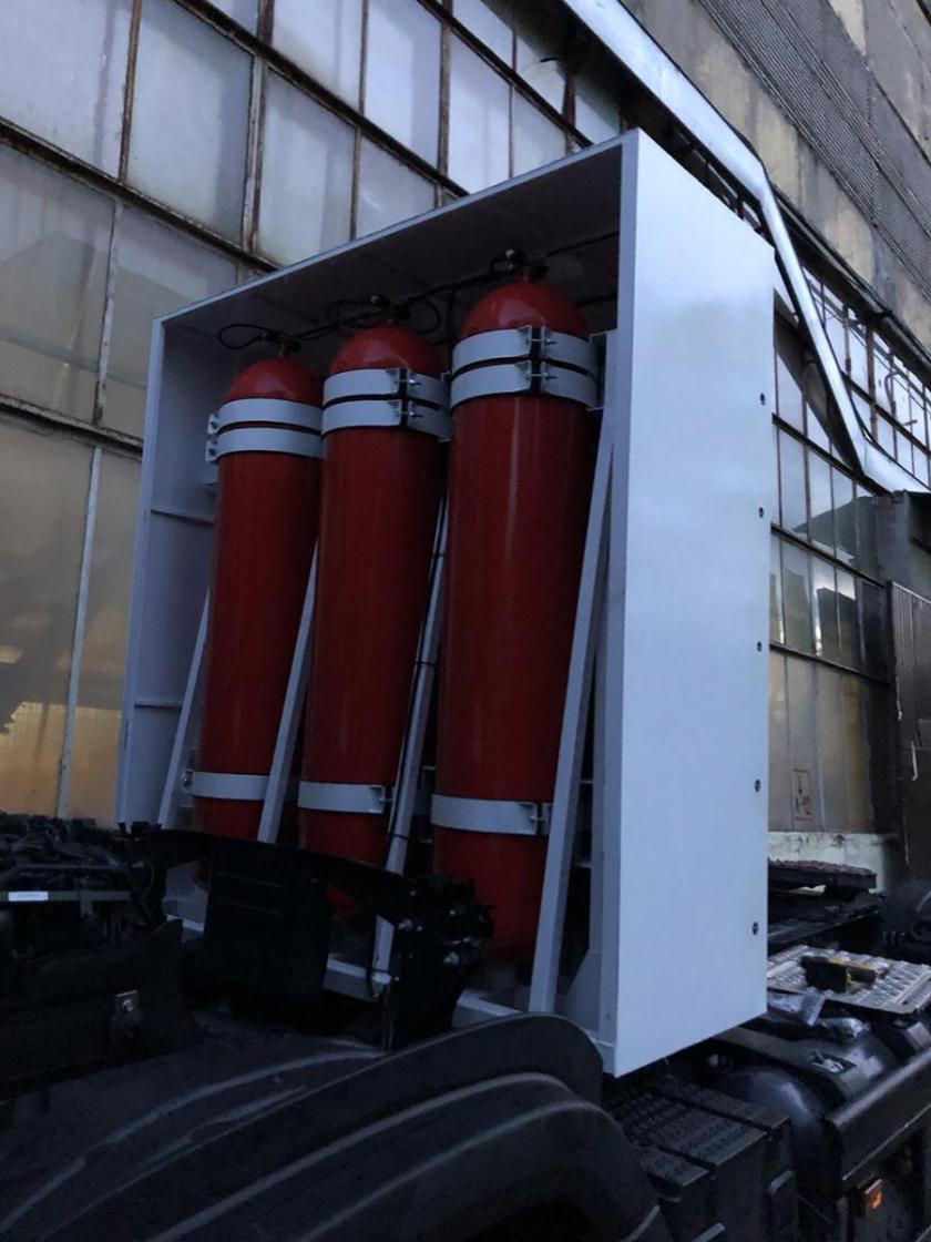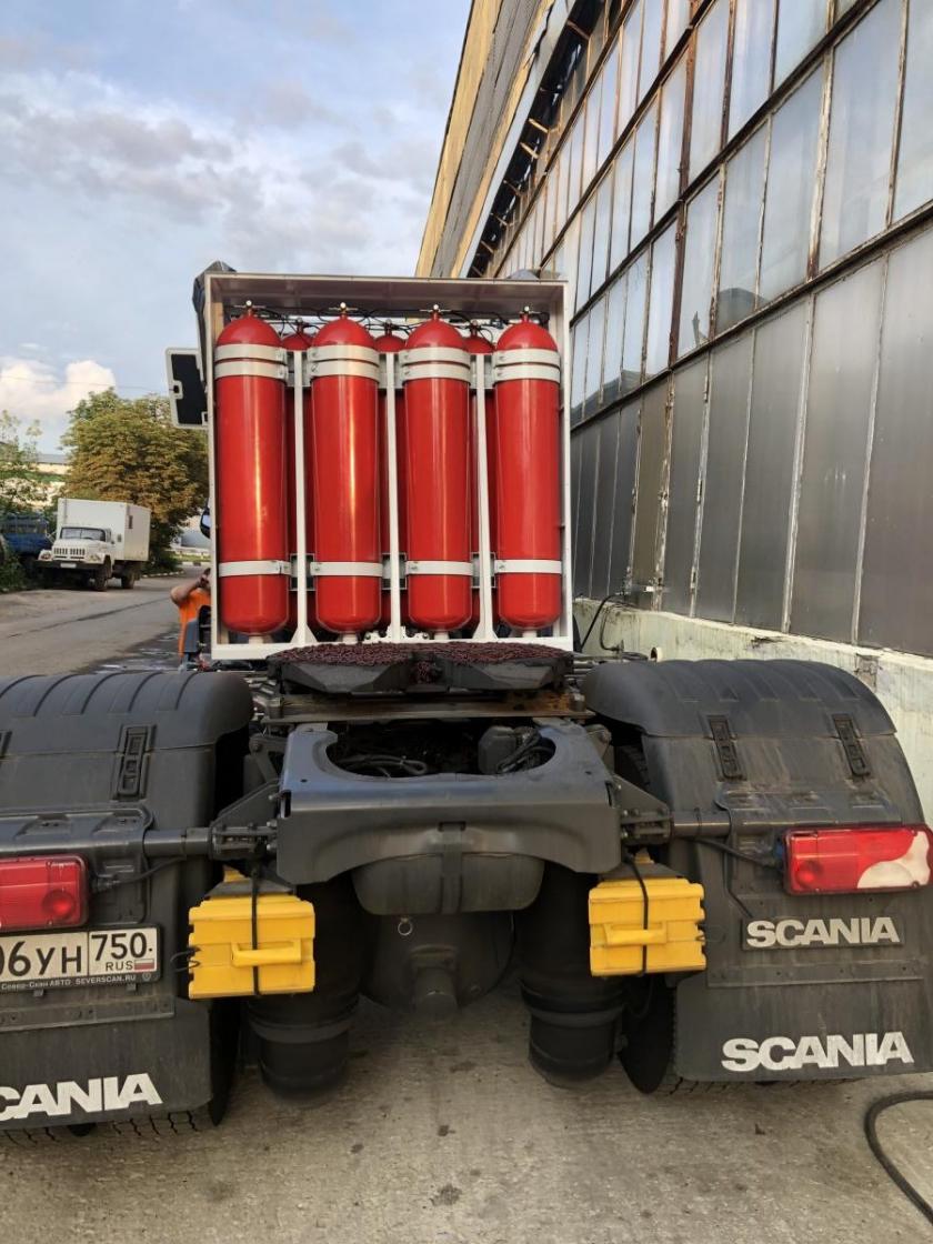 На фотографиях представлен тягач SCANIA с газовой топливной системой. На заводской автомобиль дополнительно установлена на раму за кабиной кассета для 4-х баллонов по 150 литров каждый. Баллоны подключаются к заводской топливной системе.