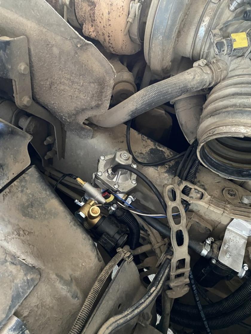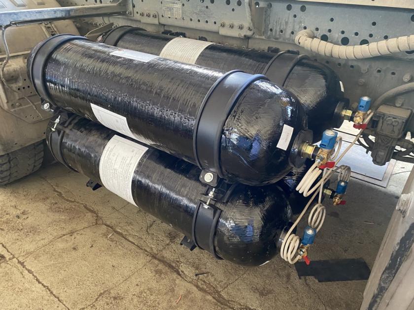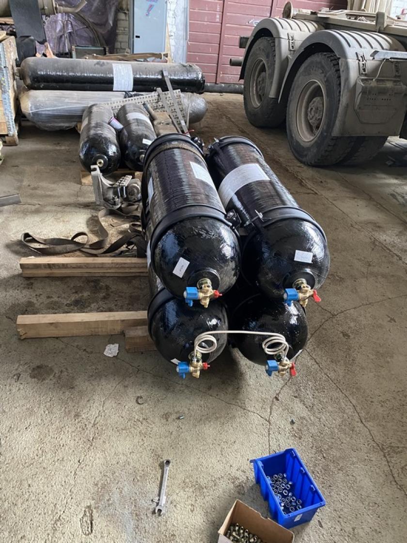 - На раме транспортного средства установлены сертифицированные цилиндрические газовые баллоны марки БВД 80.20.326-1 в количестве 4 (четыре) шт., каждый баллон имеет объем 80 л., массу в сборе 60,2 кг каждый, габаритные размеры: длина 1360мм, диаметр 326мм, с использованием соответствующих сертифицированных крепежных элементов. Моторный отсек оборудован необходимыми сертифицированными элементами и системами для возможности работы двигателя на газообразном топливе. Произведён монтаж газового редуктора, закреплённого на неподвижных и устойчивых элементах. В моторном отсеке с помощью резиновых шлангов к нему подведена система охлаждения от двигателя. На редукторе установлен электромагнитный клапан. Смонтирован и подключен контроллер. Переключатель топлива дизель и дизель/газ установлен в кабине водителя и подключен с помощью жгута проводов. Газовые форсунки смонтированы на общей рампе возле впускного коллектора двигателя на кронштейне. За редуктором установлен фильтр паровой фазы и подключен с помощью резиновых шлангов. Подключение к системе питания двигателя произведено при помощи стандартных элементов: штуцеры, трубопроводы, шланги, при этом обеспечена и произведена проверка герметичности оборудования.