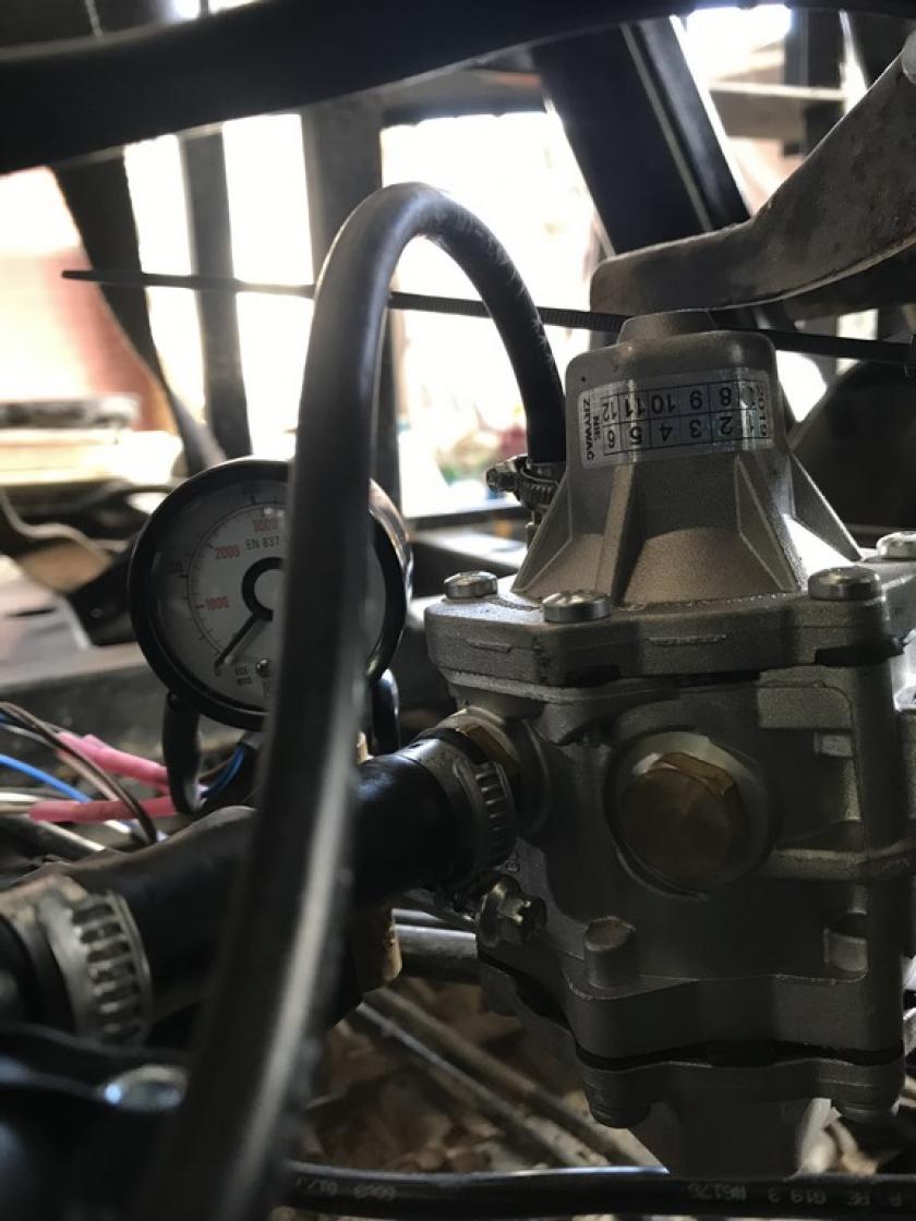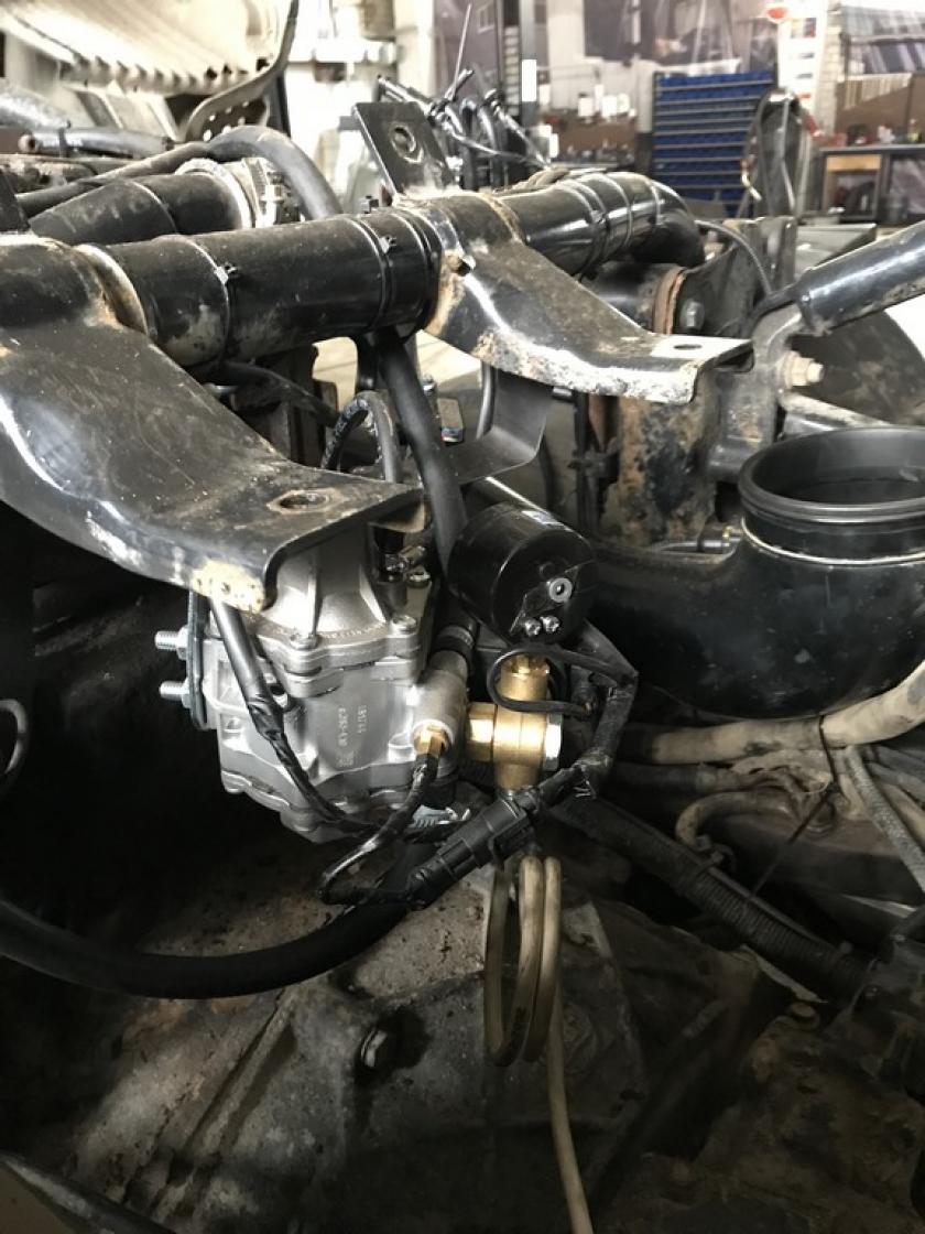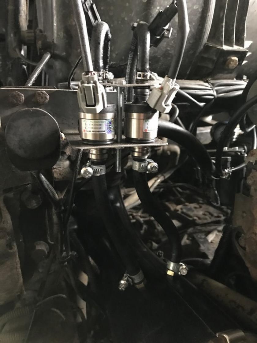 - Моторный отсек оборудован необходимыми сертифицированными элементами и системами для возможности работы двигателя на газообразном топливе. Произведён монтаж газового редуктора, закреплённого на неподвижных и устойчивых элементах. В моторном отсеке с помощью резиновых шлангов к нему подведена система охлаждения от двигателя. На редукторе установлен электромагнитный клапан. Смонтирован и подключен контроллер. Переключатель топлива дизель и дизель/газ установлен в кабине водителя и подключен с помощью жгута проводов. Газовые форсунки смонтированы на общей рампе возле впускного коллектора двигателя на кронштейне. За редуктором установлен фильтр паровой фазы и подключен с помощью резиновых шлангов. Подключение к системе питания двигателя произведено при помощи стандартных элементов: штуцеры, трубопроводы, шланги, при этом обеспечена и произведена проверка герметичности оборудования.