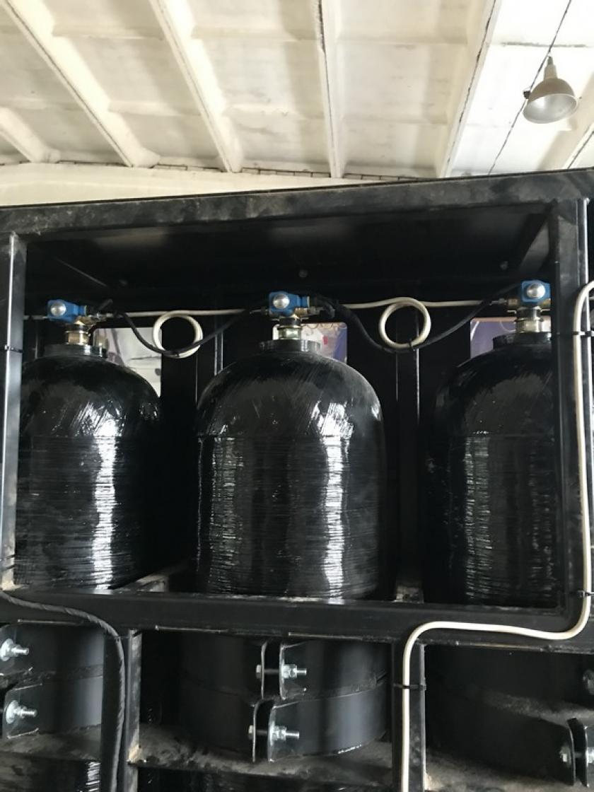 - На раме за кабиной транспортного средства установлена сертифицированная стальная кассета для 5 (пяти) баллонов, в кассете установлены сертифицированные цилиндрические газовые баллон марки БВД 123.20.326-1 в количестве 3 шт., каждый баллон имеет вместимость 123 л., массу в сборе 89 кг., габаритные размеры: длина 2000мм, диаметр 326мм, с использованием соответствующих сертифицированных крепежных элементов.