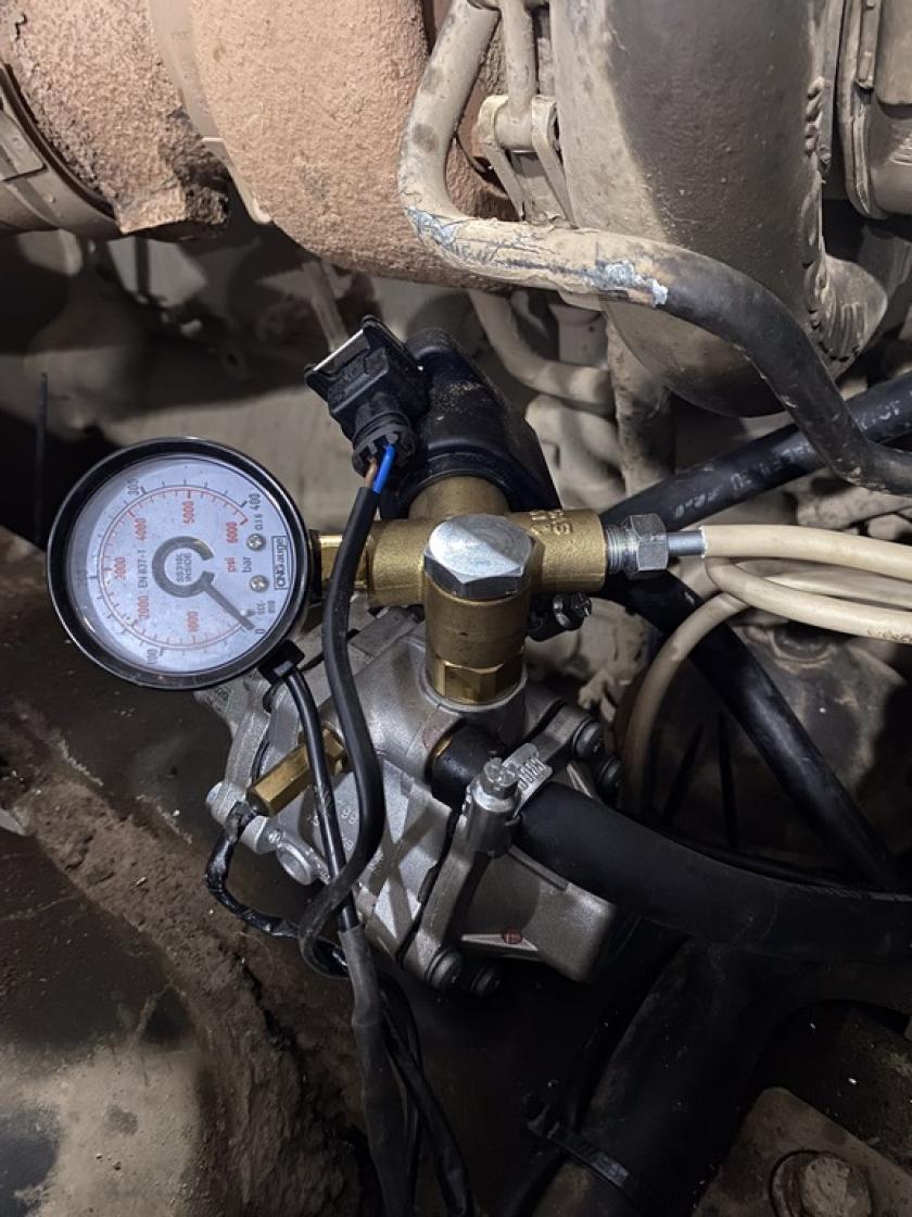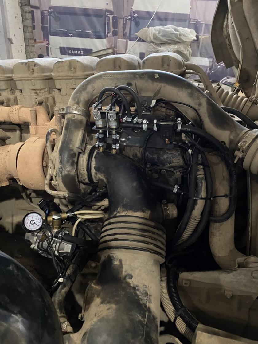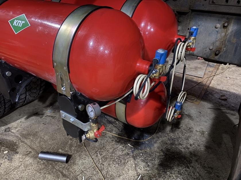 - На раме транспортного средства установлены сертифицированные цилиндрические газовые баллоны марки СПГ-1 (КПГ-1) в количестве 3 (три) шт., каждый баллон имеет объем 80 л., массу в сборе каждый 70 кг, габаритные размеры: длина 1000мм, диаметр 356мм, с использованием соответствующих сертифицированных крепежных элементов. Моторный отсек оборудован необходимыми сертифицированными элементами и системами для возможности работы двигателя на газообразном топливе. Произведён монтаж газового редуктора, закреплённого на неподвижных и устойчивых элементах. В моторном отсеке с помощью резиновых шлангов к нему подведена система охлаждения от двигателя. На редукторе установлен электромагнитный клапан. Смонтирован и подключен контроллер. Переключатель топлива дизель и дизель/газ установлен в кабине водителя и подключен с помощью жгута проводов. Газовые форсунки смонтированы на общей рампе возле впускного коллектора двигателя на кронштейне. За редуктором установлен фильтр паровой фазы и подключен с помощью резиновых шлангов. Подключение к системе питания двигателя произведено при помощи стандартных элементов: штуцеры, трубопроводы, шланги, при этом обеспечена и произведена проверка герметичности оборудования.