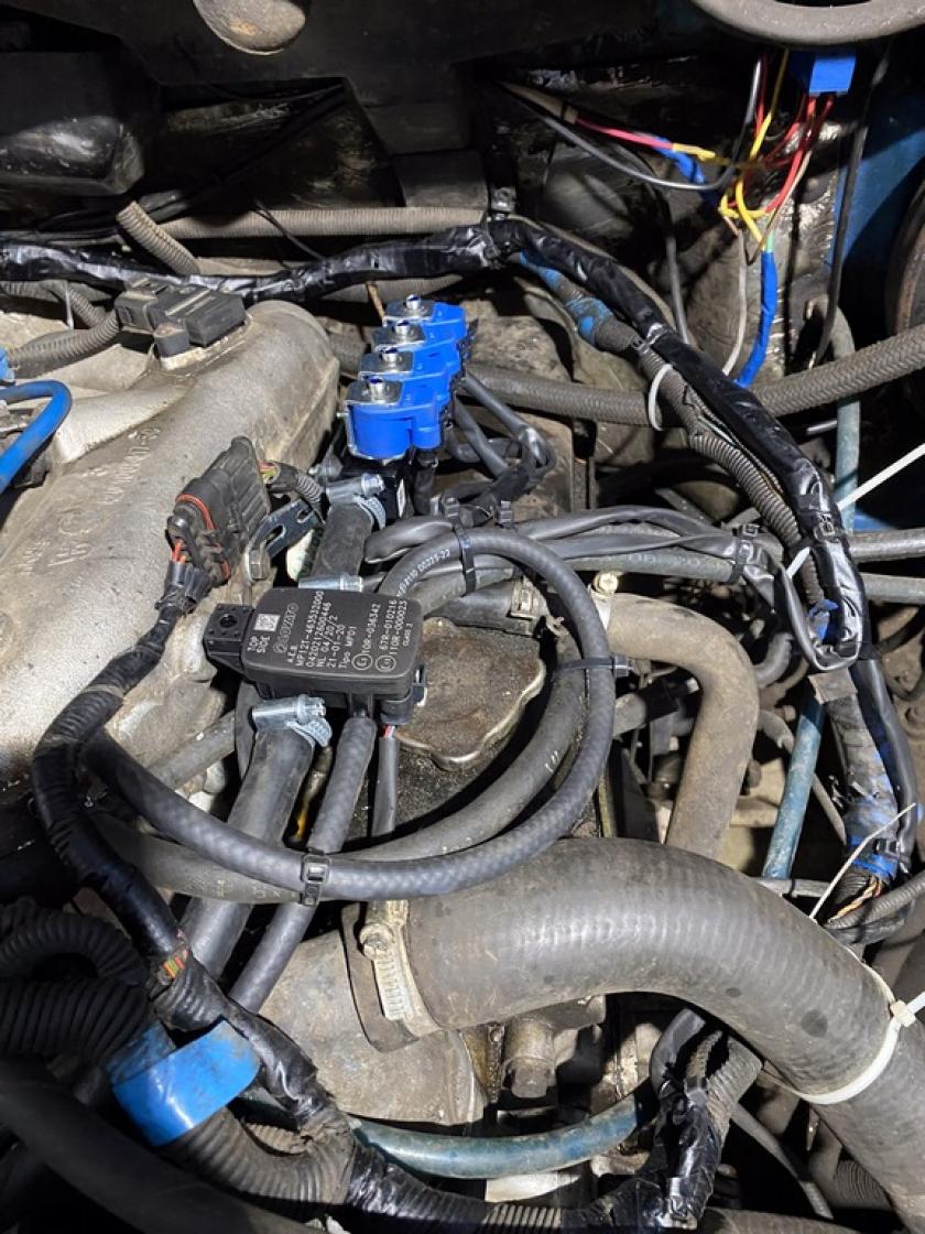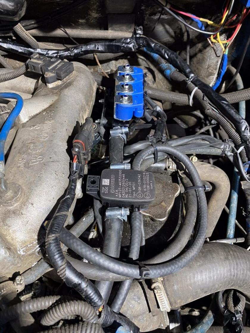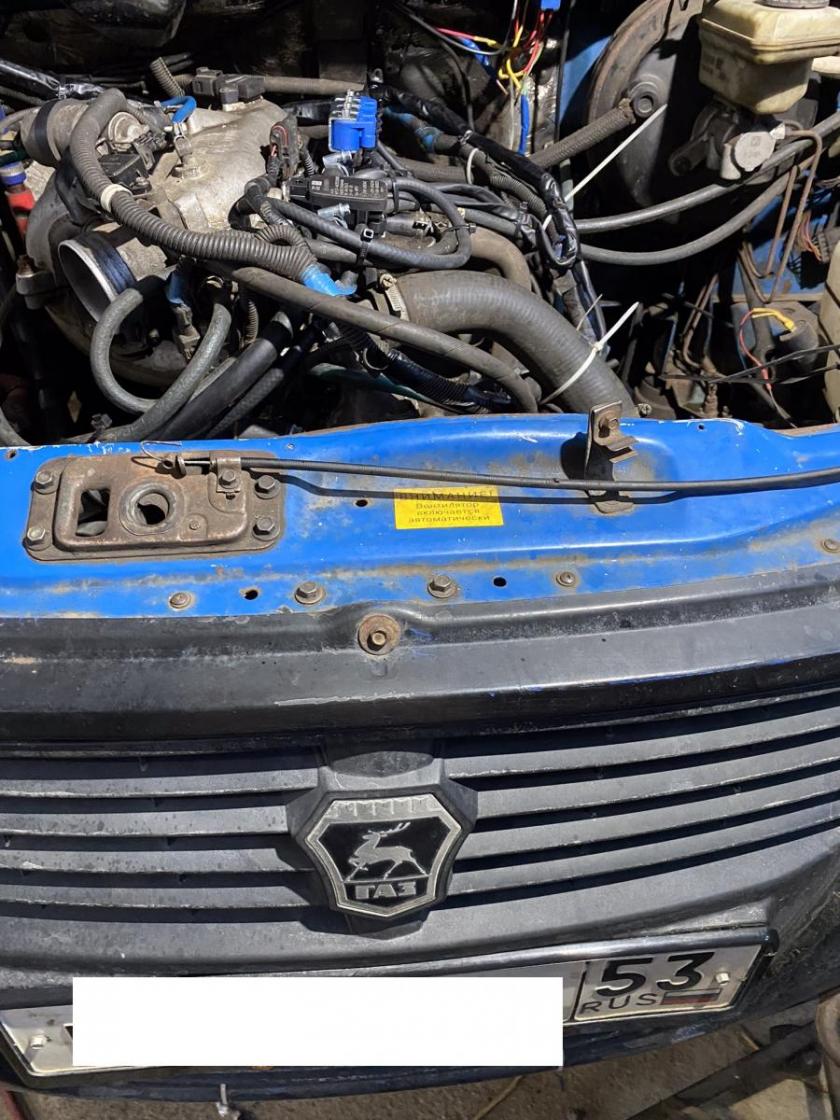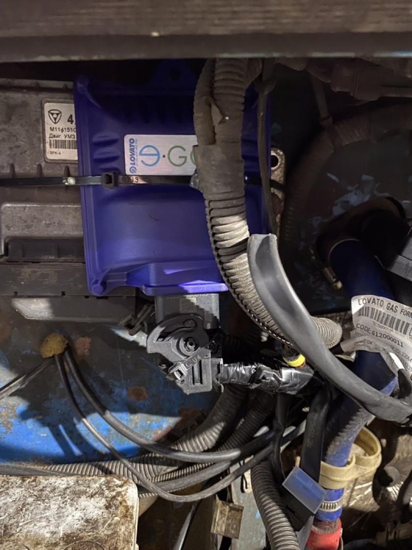 - Моторный отсек оборудован необходимыми сертифицированными элементами и системами для возможности работы двигателя на газовом топливе. Произведён монтаж газового редуктора, закреплённого на неподвижных и устойчивых элементах. В моторном отсеке с помощью резиновых шлангов к нему подведена система охлаждения от двигателя. На редукторе установлен электромагнитный клапан. Смонтирован и подключён контроллер. Переключатель вида топлива газ/бензин установлен в салоне у водителя и подключён с помощью жгута проводов. Газовые форсунки смонтированы на общей рампе возле впускного коллектора двигателя. За редуктором установлен фильтр паровой фазы и подключен с помощью резиновых шлангов. Подключение к системе питания двигателя произведено при помощи стандартных элементов: штуцеры, трубопроводы, шланги, при этом обеспечена и произведена проверка герметичности оборудования.