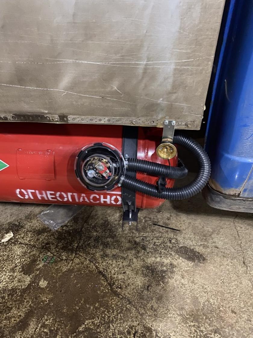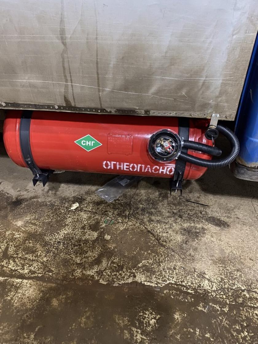 - На раме справа по ходу движения смонтирован сертифицированный цилиндрический газовый баллон марки АГГ-130, объемом 130л. с аппаратурой, с использованием соответствующих сертифицированных крепежных элементов. Количество установленных газовых баллонов — 1 (один), производитель баллона ОАО «Новогрудский завод газовой аппаратуры». Газовый баллон установлен на транспортном средстве стационарно. Газовый баллон установлен в соответствии с инструкциями завода-изготовителя баллона.