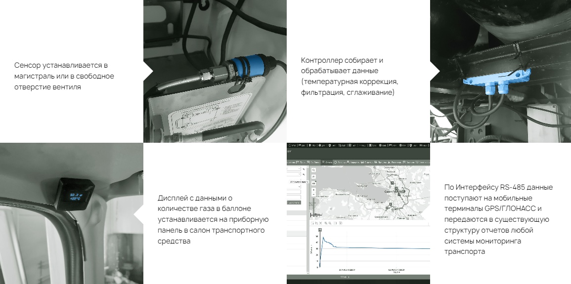 - Данные поступают в мобильные терминалы GPS/ ГЛОНАСС и передаются в существующую структуру отчетов любой системы мониторинга транспорта по RS-485 протокол LLS. Опционально дисплей с данными можно установить на приборную панель в салон транспортного средства